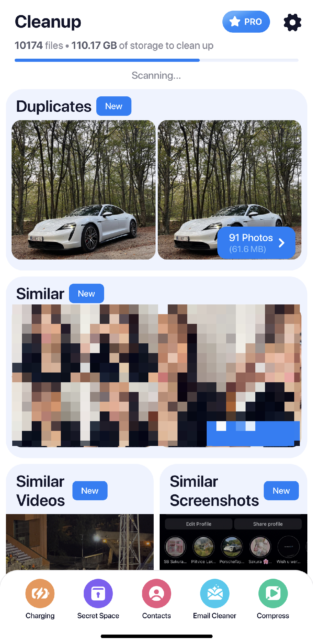 - “Fast Clean” feature for efficient scanning and removing duplicate photos and large videos