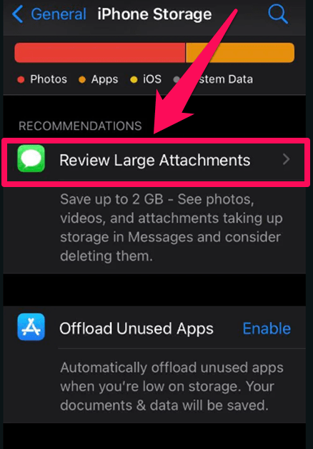 - Go to iPhone Storage. You’ll see a Review Large Attachments option under the Recommendations tab if you have large attachments on your iPhone. If this option is unavailable, it implies you don’t have sizeable attachments on your phone.