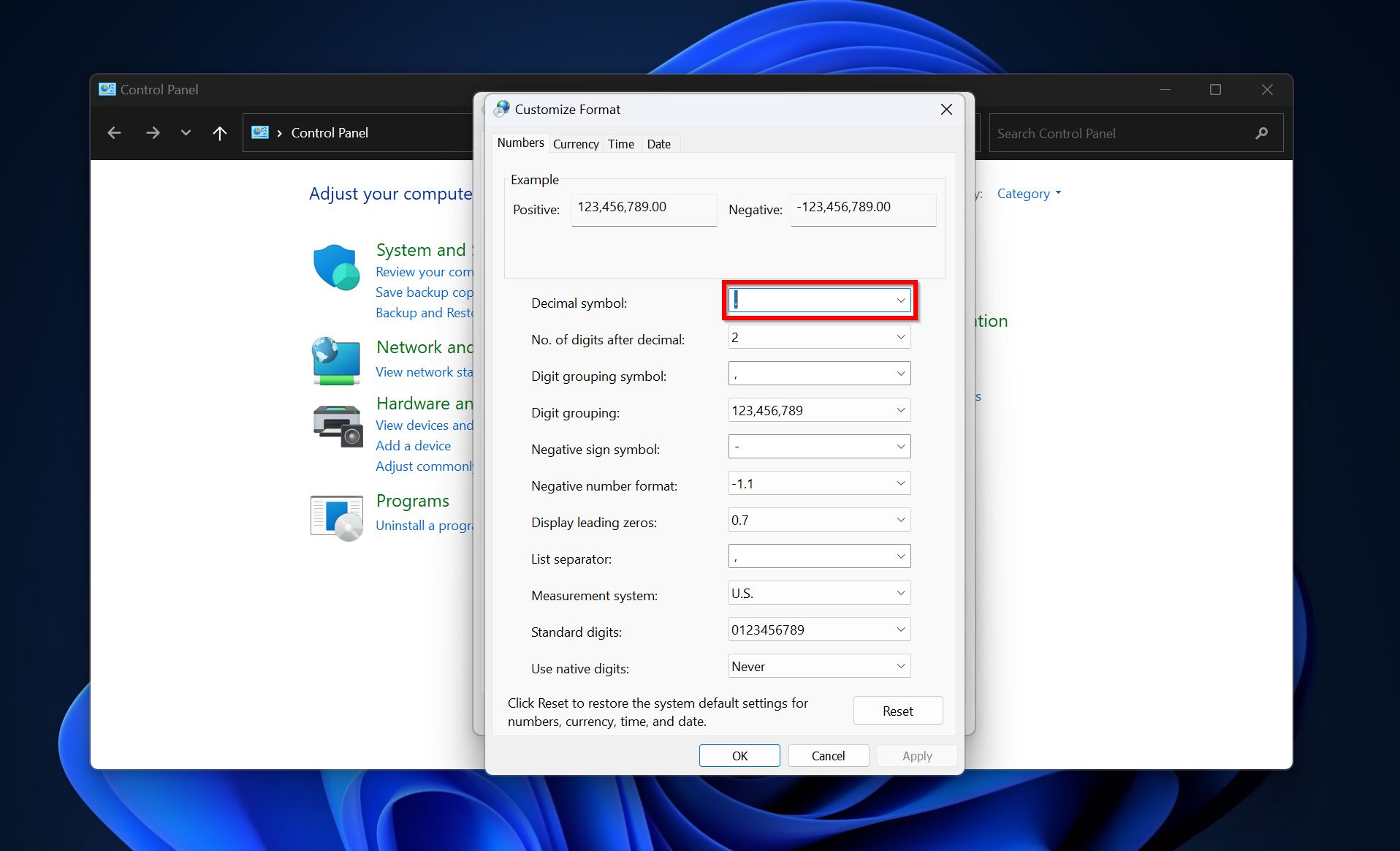 Believe it or not, an incorrectly set decimal symbol can result in the parameter is incorrect error. Fortunately, fixing it is easy. You just need to take a trip to the Control Panel.