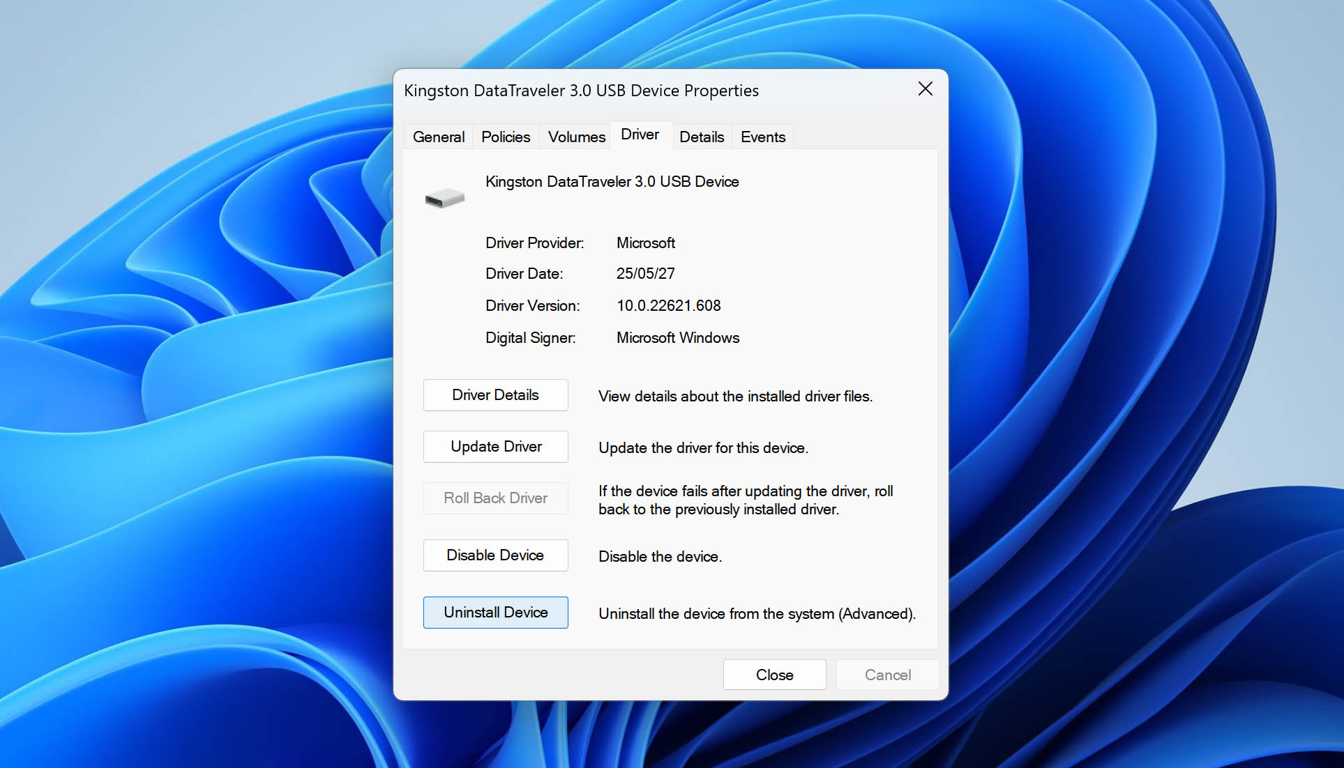 - If this hasn’t worked for you, go back and click Uninstall Device. This will uninstall the existing drivers from your system. Unplug the drive then plug it back in again for the drivers to be reinstalled.