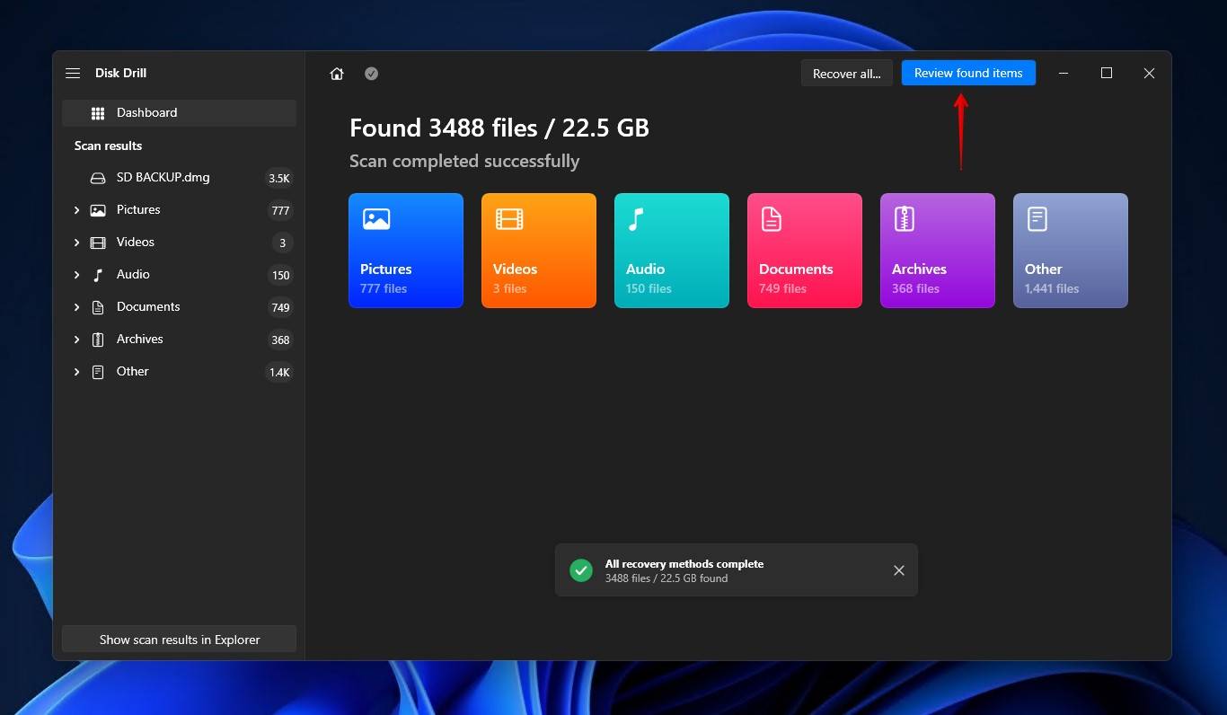 - Click Review found items once the scan is complete. You also have the option of recovering everything instead by clicking Recover all.