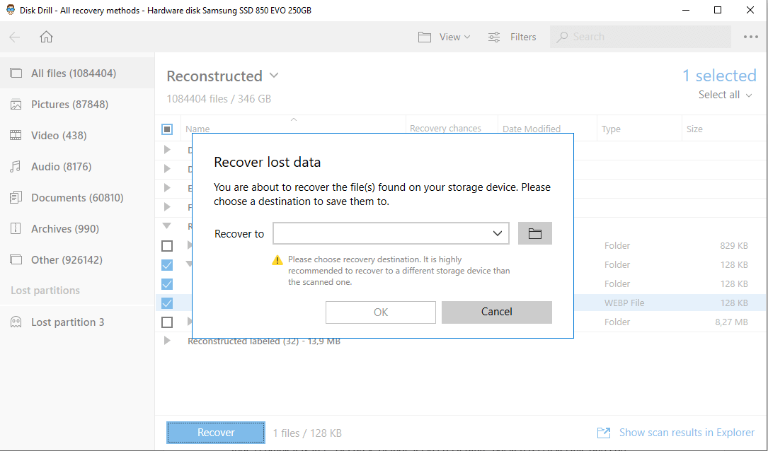 - Click the Recover button and choose a destination where you want Disk Drill to send your lost files to (be sure to store the files to a different volume/drive to avoid overwriting).