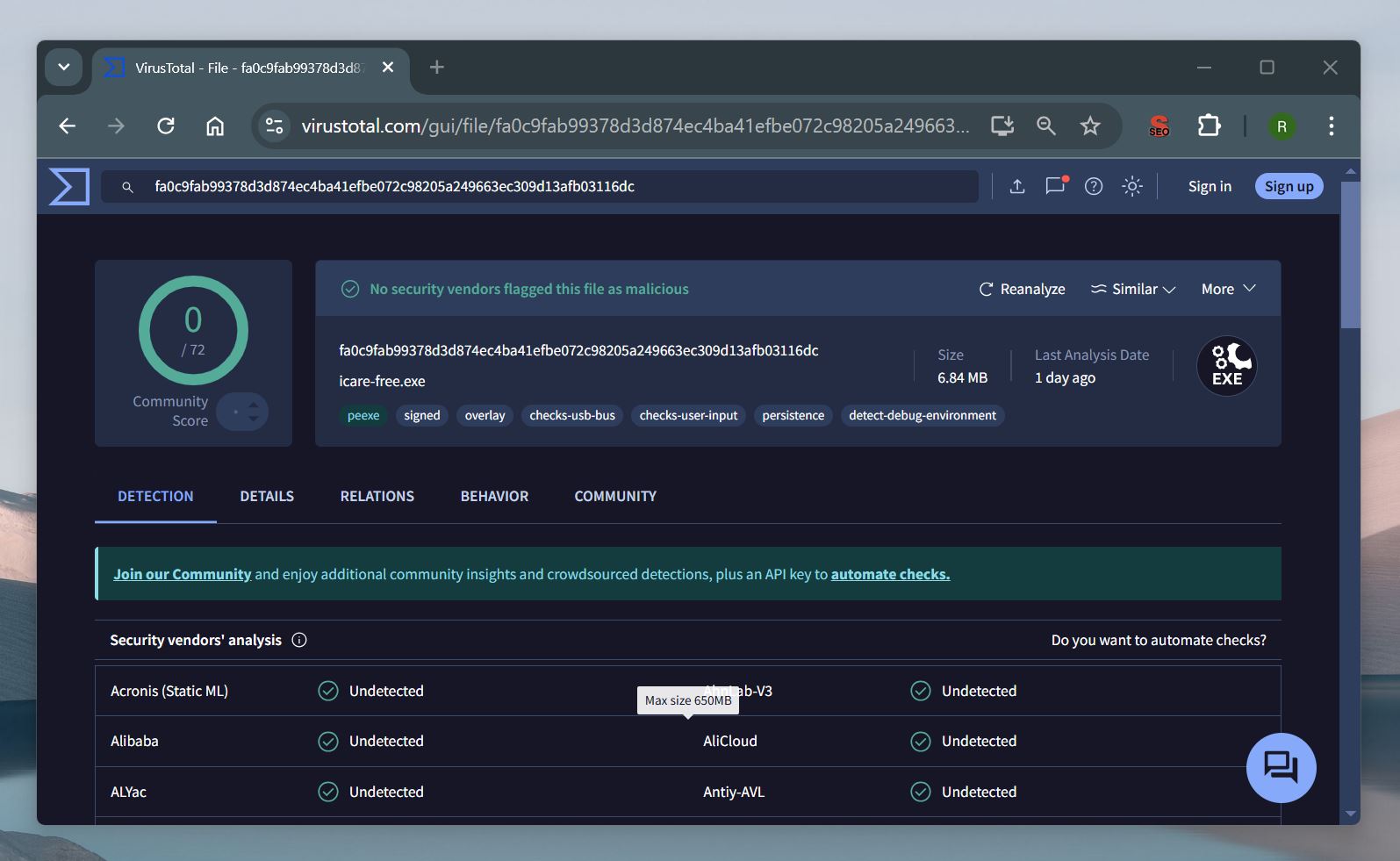 In terms of malware safety and compliance with data protection laws, iCare Data Recovery passes the test. As always, we checked the software with VirusTotal.com, which scans files against dozens of antivirus engines. The results came back clean—0/72 detections—so iCare Recovery does not contain any malware, spyware, or other harmful components.