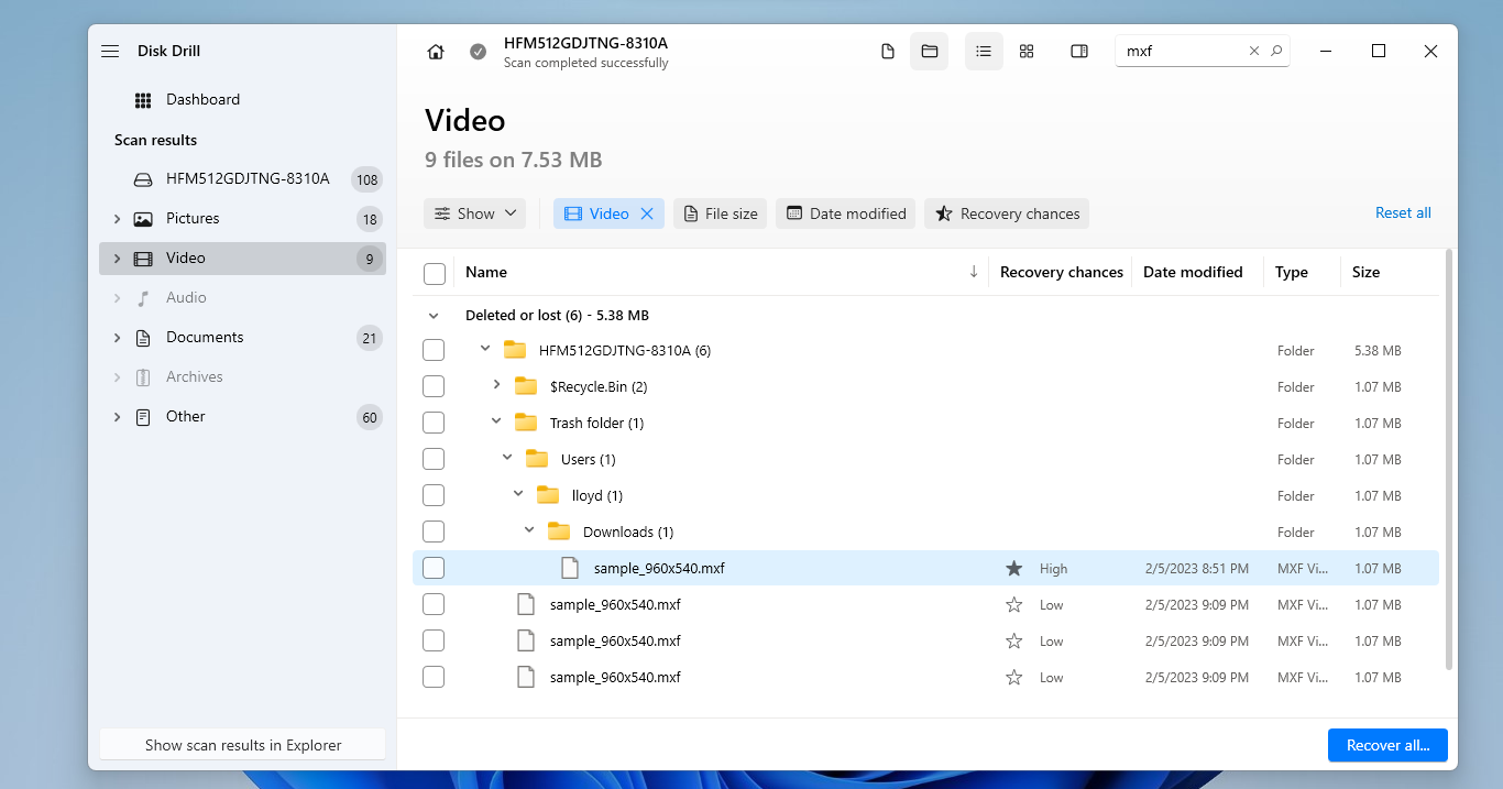 - Disk Drill will now display all recovered files with, if possible, their folder structure. Since we are looking for MXF files only, select the Video category from the left and type mxf in the search bar at the top. This will narrow down the results to MXF files only.