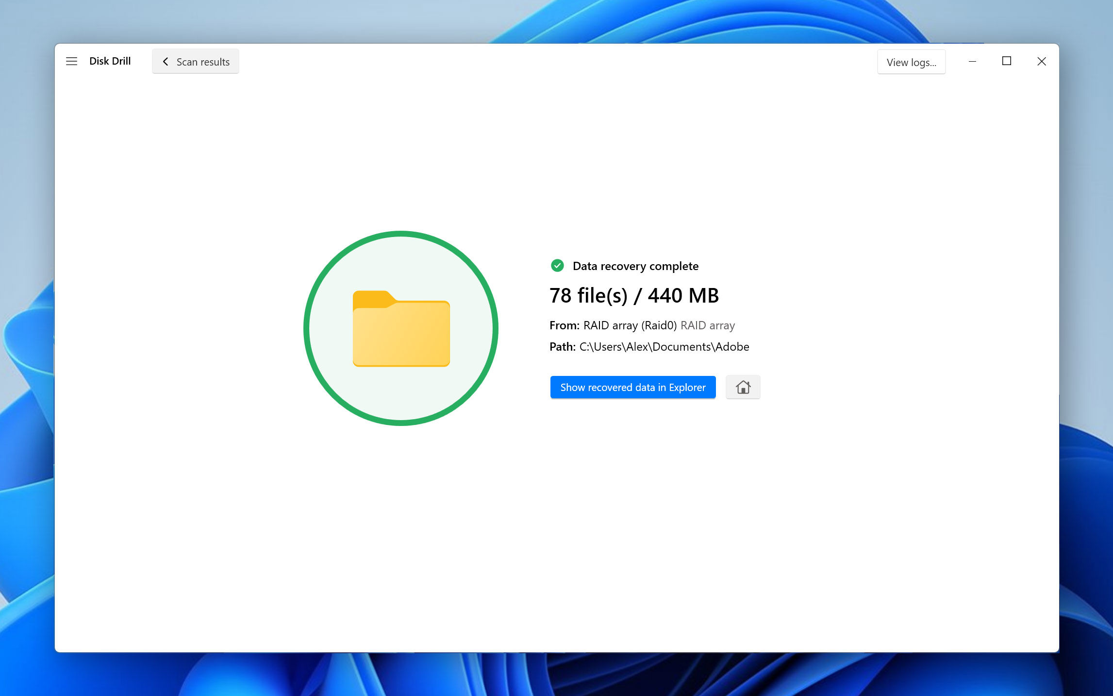- Soon after, Disk Drill will show you a summary of the results. Click Show recovered data in Explorer to see your recovered files using the OS’s default file manager.