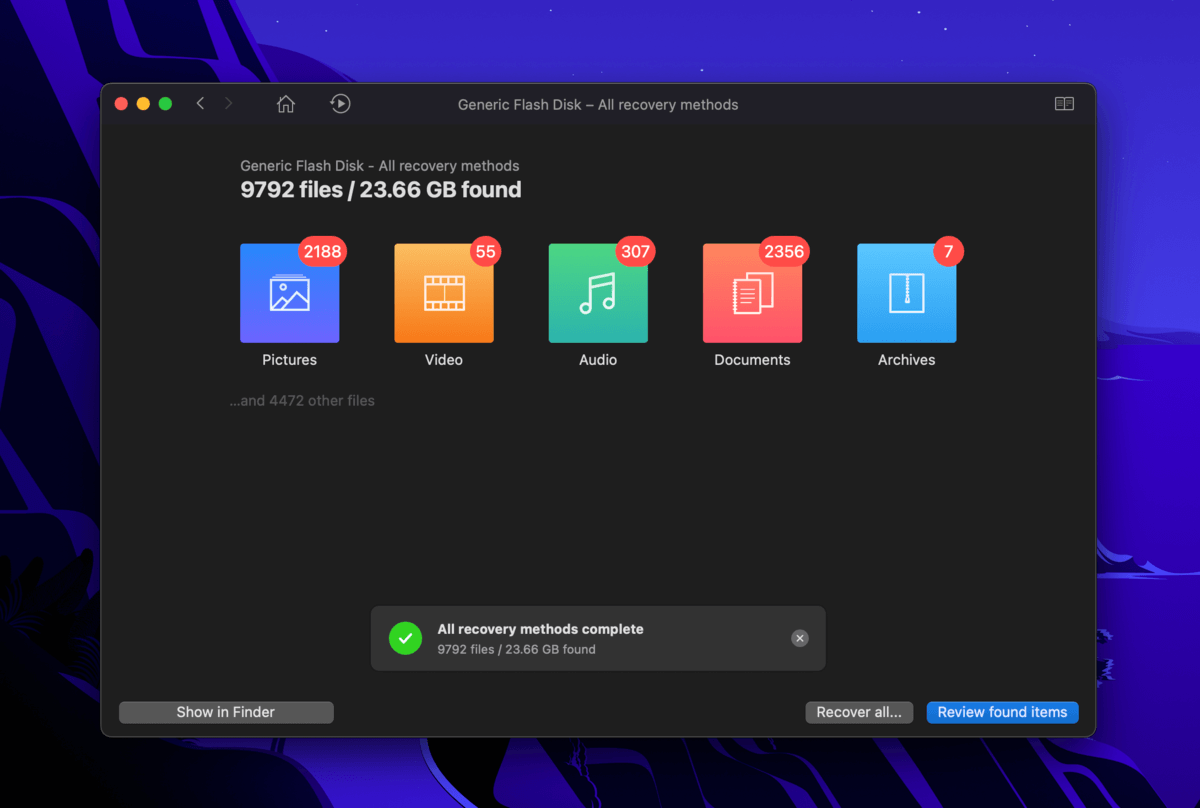 - You can click Review found items right after the scan ends or even before it does. If you don’t want to wait until the entire process finishes, you can check the results as they appear. Disk Drill updates the list in real time, and the number of recoverable files grows as the scan goes on.