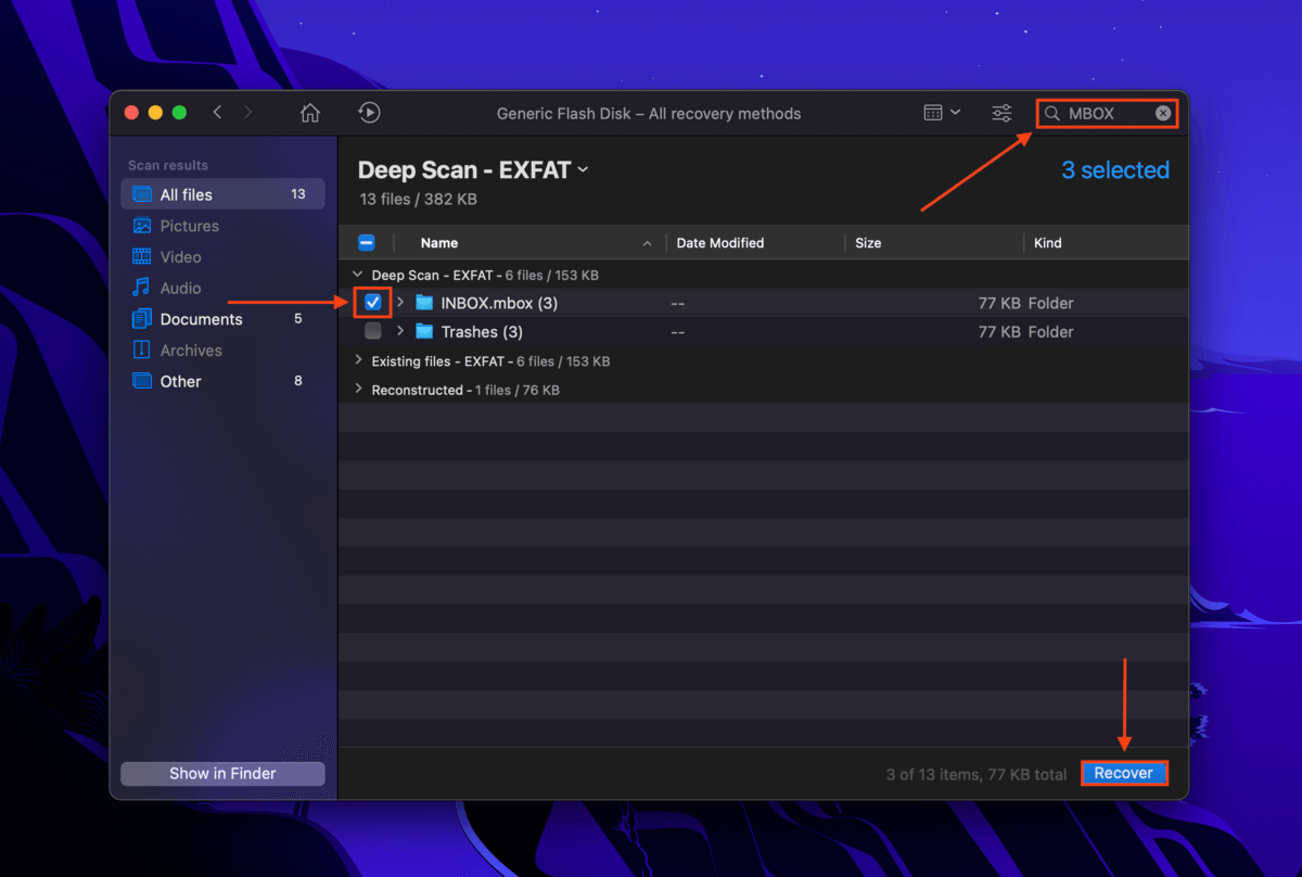 - To quickly find deleted emails on your Mac, type MBOX or EMLX in the search bar in the upper-right corner of the window. Your MBOX data usually comes in folder – fortunately, Disk Drill can recover deleted folders as a whole. Once you locate your MBOX folder or EMLX files, tick the boxes in the left-most column and click Recover.