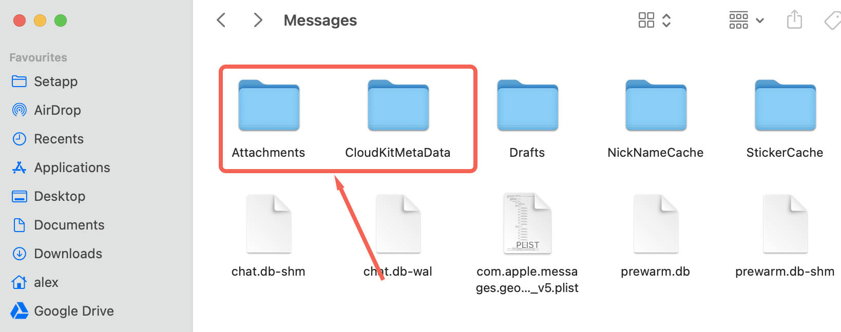 - Open up finder and navigate to ~/Library/Message. You’ll be looking for folders called “Attachment”, “Archive”, and “CloudKitMetaData”, and a file called “chat.db”.