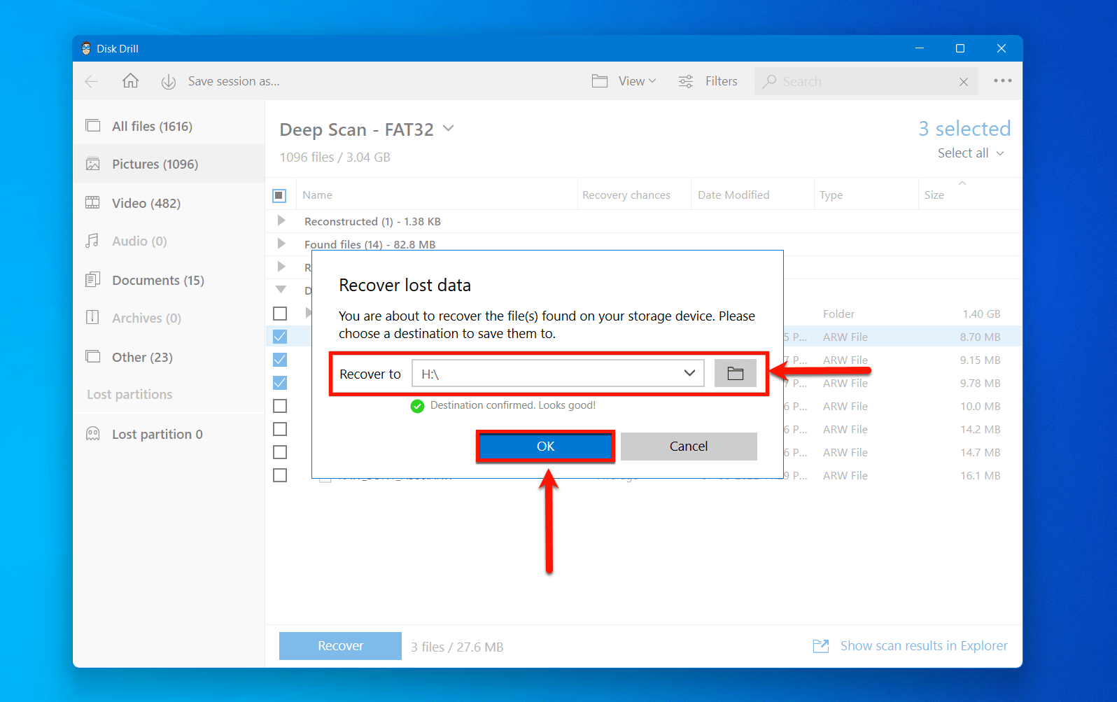 Disk Drill will ask you to choose a destination folder before it begins recovering. Important: don’t save the files back to the same memory card or drive you’re recovering from. If you try, Disk Drill will warn you.