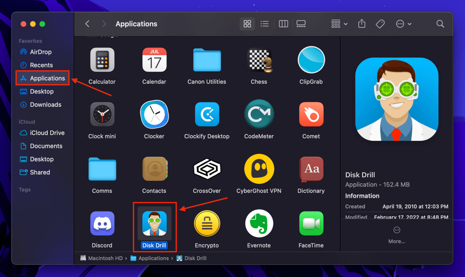 - Launch Disk Drill by opening Finder > Applications and double-clicking the Disk Drill icon.