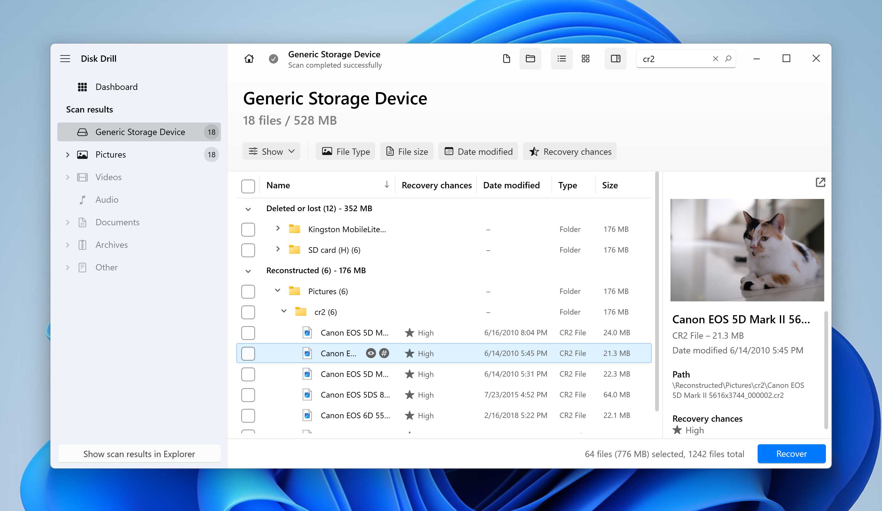 - Search for the file you want to recover either via the search bar at the top-right corner or by file type at the left sidebar. We also recommend previewing the file by hovering your mouse to the right and clicking the eye button that appears. This ensures you recover the correct files as data recovery software sometimes struggles to restore original file names. This works for most file types including RAW. In the screenshot below, we are previewing a photo taken by our Canon camera.