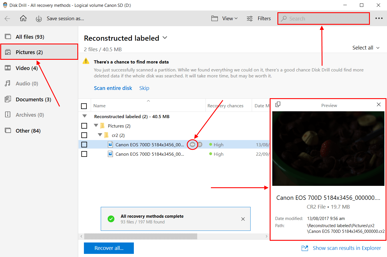 - Search for the file you want to recover either via the search bar at the top-right corner or by file type at the left sidebar. We also recommend previewing the file by hovering your mouse to the right and clicking the eye button that appears. This ensures you recover the correct files as data recovery software sometimes struggles to restore original file names. This works for most file types including RAW. In the screenshot below, we are previewing a photo taken by our Canon camera.